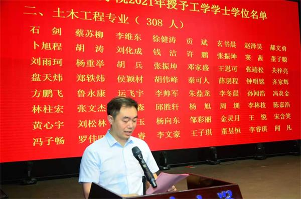 蒋琦玮书记宣读了2021届湖南省优秀本科毕业生名单、2021届红足1世77814优秀本科毕业生名单。